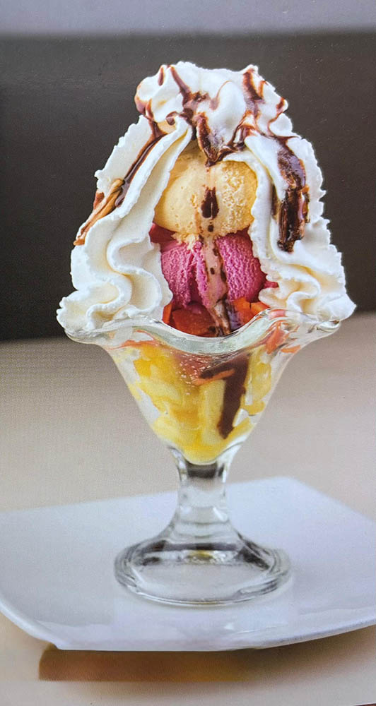 Dos bolas  de helad, crema chantilly, pecanas, fudge y fruta picada